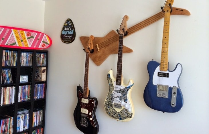Guitar stands aren’t always the best option though. For people with small children or pets, putting a guitar on the ground could be very risky. If you’re worried about your children or pets getting to your guitars, go with a guitar wall hanger.