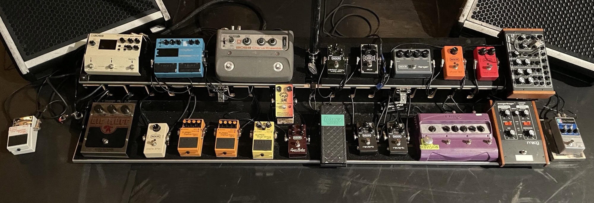 Of late, he’s been using a truly gargantuan pedalboard: it’s more like three boards in total. Even in an era of most stadium rock bands switching to profilers, John Frusciante gets most of his sound from pedals.