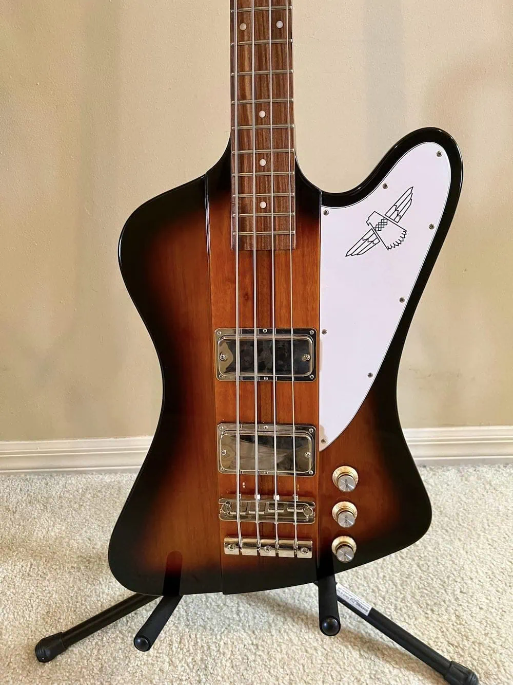 You can find an Epiphone Thunderbird as a reasonably-priced alternative to the Rickenbacker or a Gibson Thunderbird.